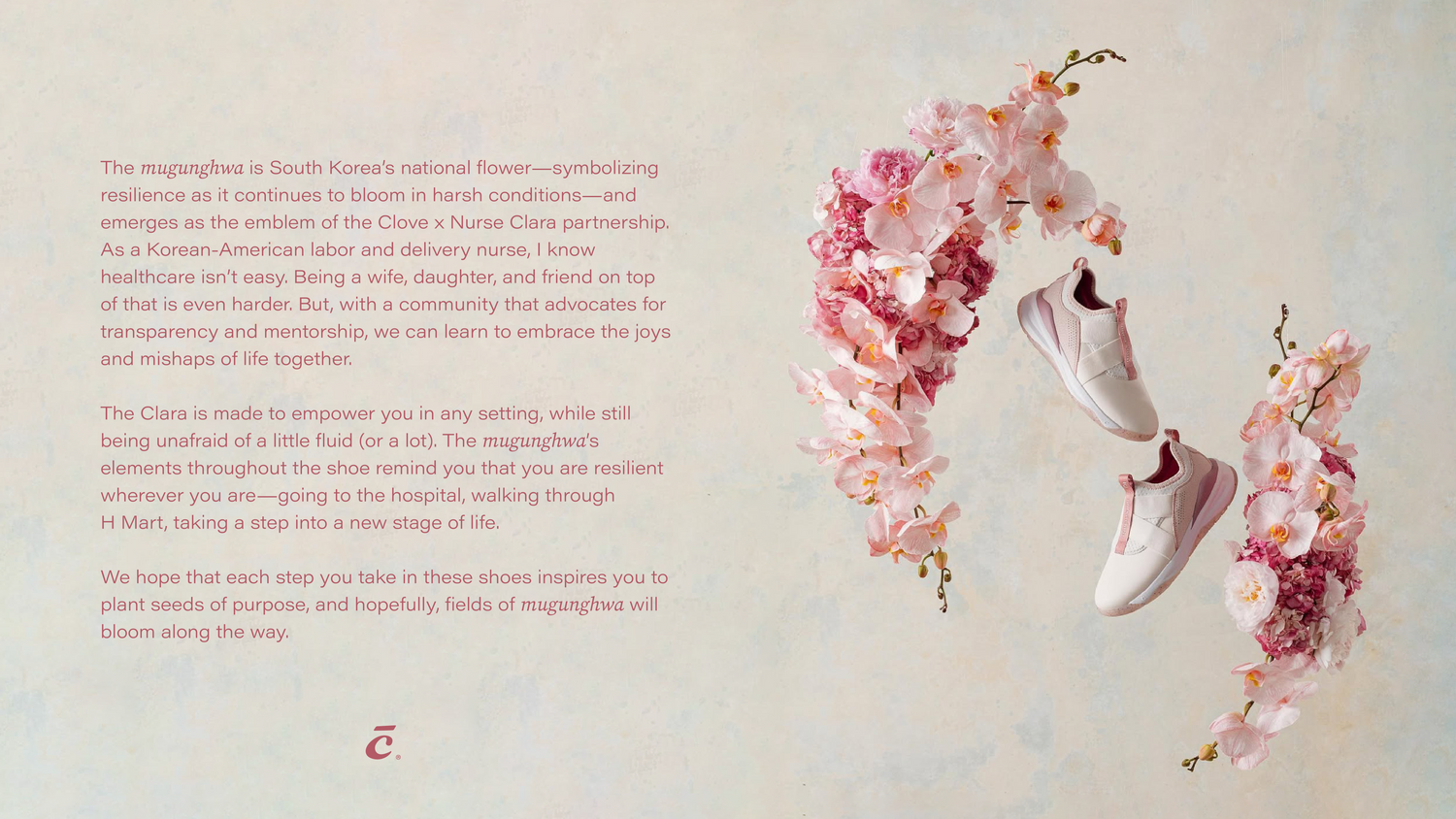 From the start, Clara and I connected on a personal level. We were both Korean American, and she wanted the sneaker to carry elements of our shared culture. That conversation led to the heart of the Clara 1: the Mugunghwa flower. As South Korea's national flower, the Mugunghwa represents resilience, a quality that defines every healthcare professional working today.